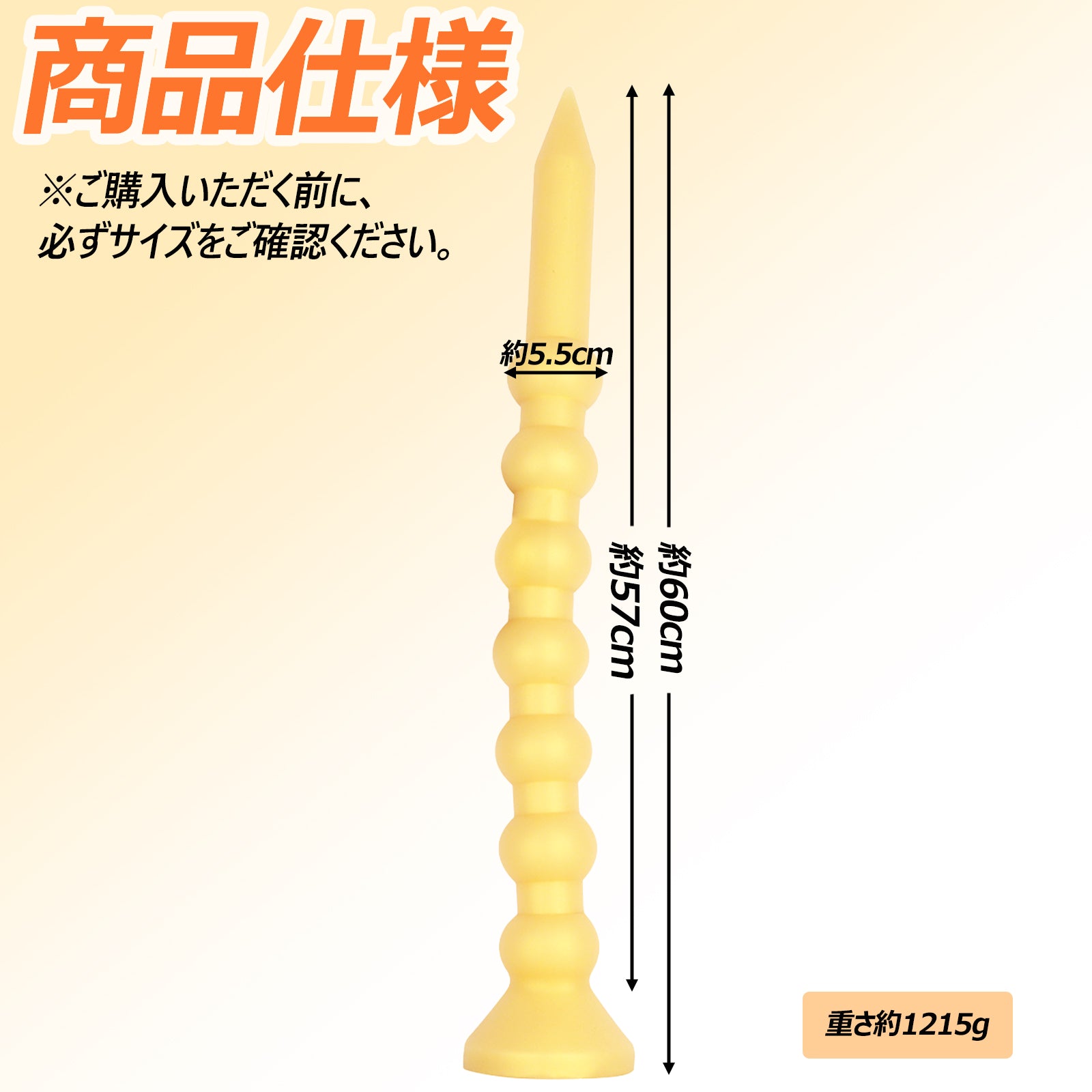 サイズ:直径は約5.5cm、可挿入長さは約57cm、全長は約60cmです。重さは約1215gです。※ご購入いただく前に、必ずサイズをご確認ください。