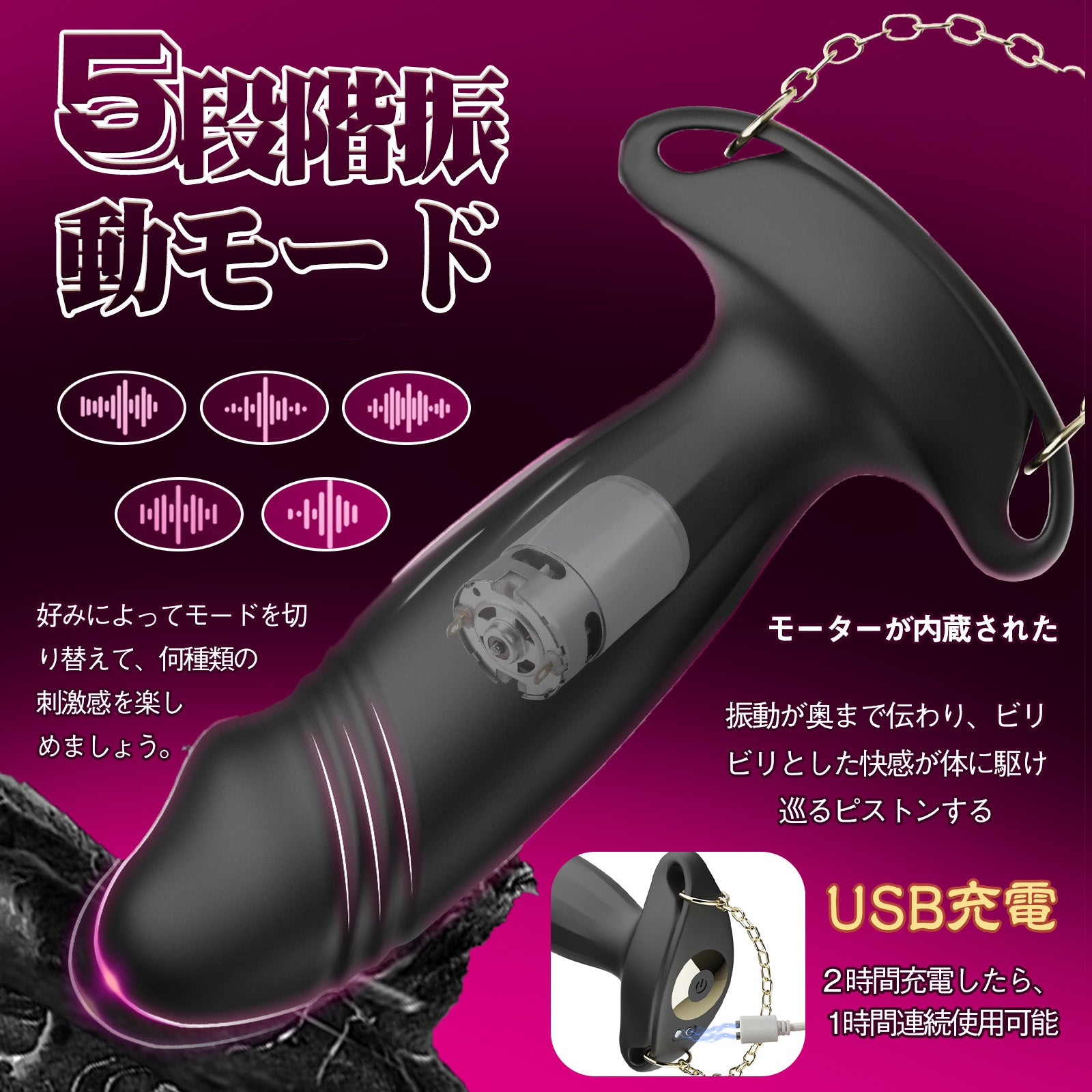 5段階振動モード:強力なモーターが内蔵されたため、振動が奥に伝わっていない心配がいらなく、ビリビリとした刺激感が全身に駆け巡って気持ちいいです。5種類の振動モードを持っていているため、自由に切り替えて、異なるモードによる快感を全部楽しめて大満足です。