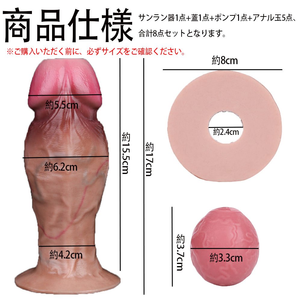 商品仕様:サンラン器:先端直径は約2.4cmで、最大直径は約6.2cm、全長は約17cmです。アナル玉:最大直径は3.3cmで、全長は約3.7cmです。サンラン器1点+蓋1点+ポンプ1点+アナル玉5点、合計8点セットとなります。※ご購入いただく前に、必ずサイズをご確認ください。